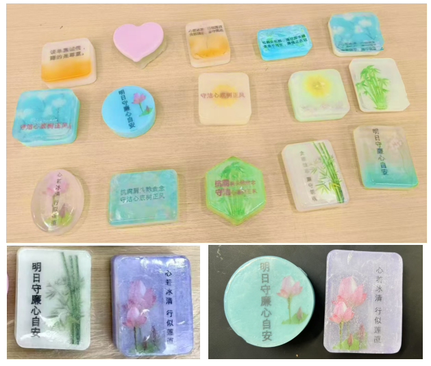 随后,与会师生们兴致盎然地投入廉洁主题手工香皂制作。从熔化皂基,到调色调味,再到入模定型,最后包装设计,承载廉洁寓意的独特香皂在指尖诞生。整个制作过程,不仅是一次手作体验,更成为廉洁理念具象化、情感化的生动载体。