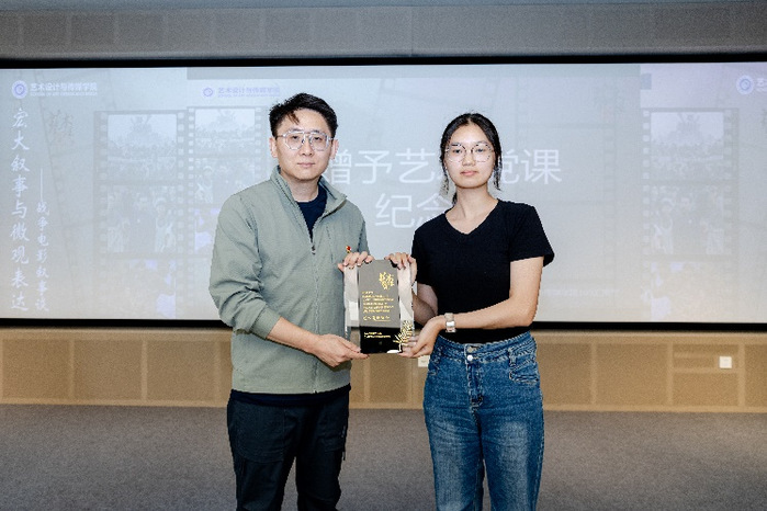 活动尾声,学生代表周佳宁向张珂老师赠送了艺术党课纪念牌并致谢。