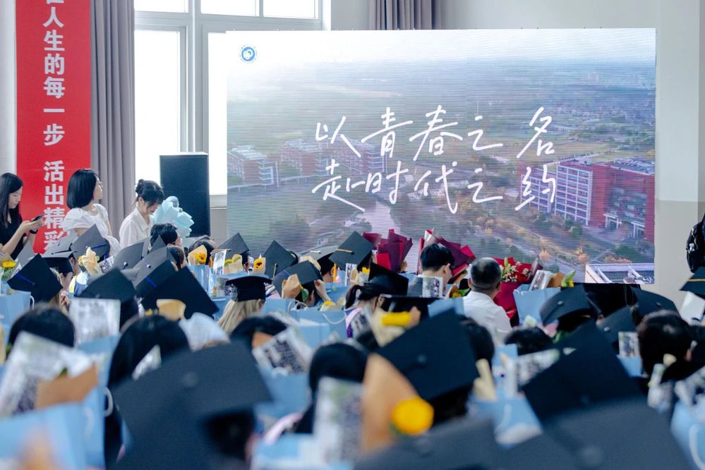 在激昂的乐曲声中,沈海涛、王珊、汪军等领导、老师,为2025届毕业生拨穗正冠,赠送毕业纪念卷轴,并衷心祝贺各位学子顺利毕业。