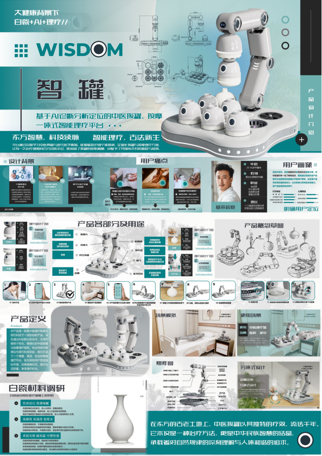 中医拔罐,千年智慧,今融现代AI技术,本创新概念产品集中医理疗与现代科技于一体,利用白瓷特性改进拔罐原理,深度学习中医典籍与现代医学数据,AI精准诊断分析,提供定制化、精准化拔罐与按摩服务。便捷、高效、专业且安全,满足单人独立使用,营造放松环境,改善用户健康状况,提升生活质量。