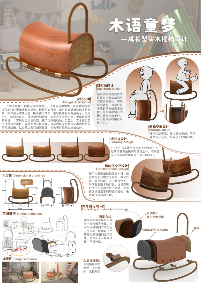 “木语童梦”儿童摇椅采用樱桃木主体,随时间氧化变色记录成长。可变形设计:幼时为趣味木马,成长后转为学习椅,兼具收纳功能。巧用木材色差,打造自然成长伴侣。