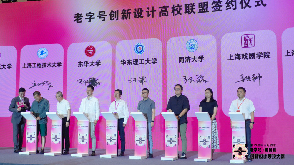本届大赛还形成了一项标志性成果:华理牵手在设计领域实力强劲的高校,成立了“老字号创新设计高校联盟”。各高校将发挥设计、科研、人才等资源优势,成为老字号企业的 “创新智囊团”,共同推动老字号创新发展之路行稳致远。华东理工大学艺术设计与传媒学院院长汪军、东华大学服装与艺术设计学院院长孙捷、上海应用技术大学艺术与设计学院党委书记胡艺、上海工程技术大学艺术设计学院院长高瞩、同济大学设计创意学院副院长张磊、上海戏剧学院创意学院副院长铁钟、广西师范大学设计学院院长刘涛、浙江传媒学院设计艺术学院院长康修机代表各自学校进行了签约。