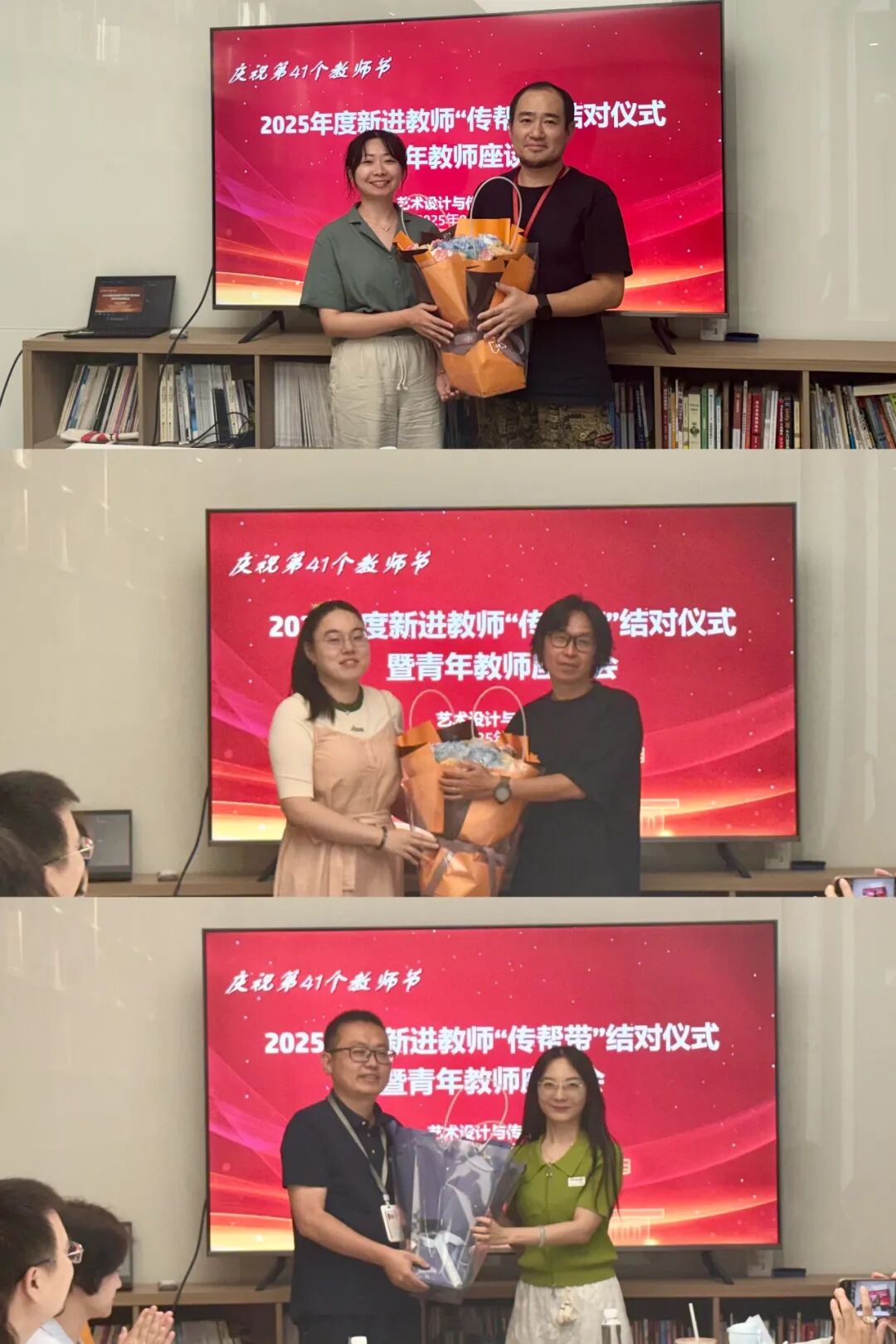 在第41个教师节来临之际,为深入贯彻落实“以教育家精神铸魂强师,谱写教育强国建设华章”的主题精神,9月9日下午,在晨园110,艺术学院组织召开了新进教师结对仪式暨青年教师座谈会。学院党委书记王珊,副院长章彰,校工会副主席、学院工会主席叶俊男,青年教师代表,新进教师及带教导师等出席。会议由学院工会组织委员付蓉主持。